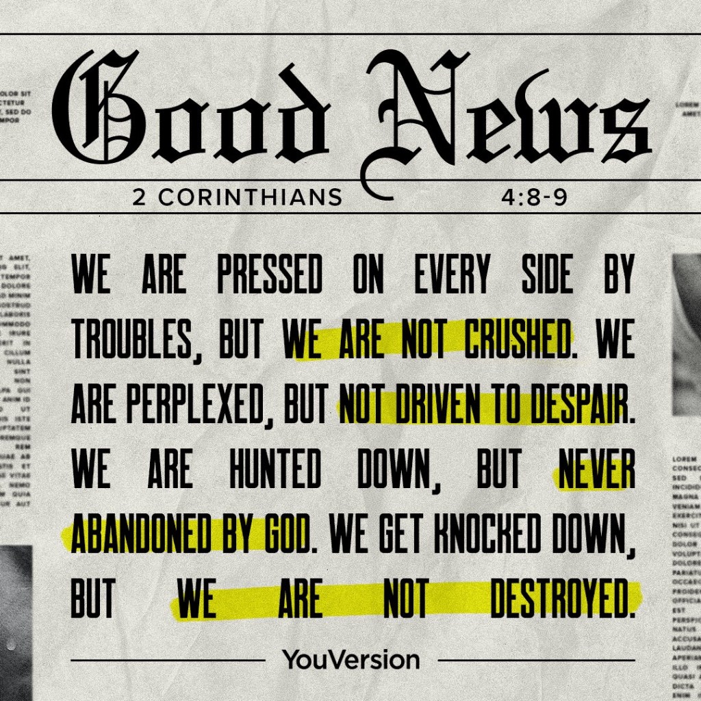We are not crushed, not driven to despair, never abandoned by God. We are not destroyed!