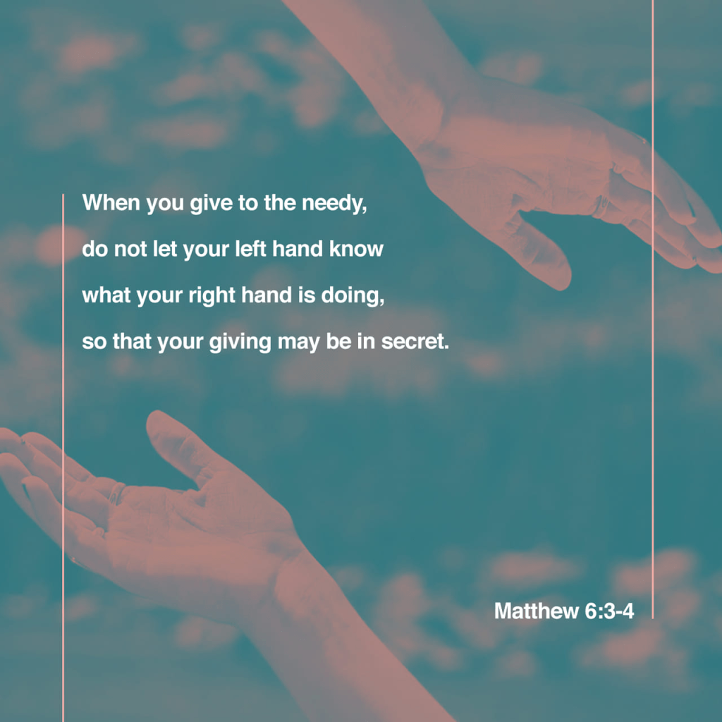 But when you give to the needy, do not let your left hand know what your right hand is doing. This is one of my favorite verses only because I love doing things for others. This verse kind of confused me when I first read it. How could you not let your left hand know what your right hand is doing? Do you hide it behind your back so it’s not visible? No. This is simply saying that when we give then we need to do so in a manner that is quiet. When we give do we do it in front of others so we can show off? Are we giving so that we can get something in return? I will give you a couple of good examples of giving without people knowing. Someone could be short on cash for the month with an unexpected bill. Pray and ask God how you can help. My wife and I have been impressed by the Holy Spirit to drop a box of groceries on a doorstep. You can pray unceasingly for that person. Maybe the Holy Spirit even impresses you to leave an envelope with money without a name on it. Pray today and ask how you can help these individuals who are in need. It is always fun and rewarding to see how He answers us.