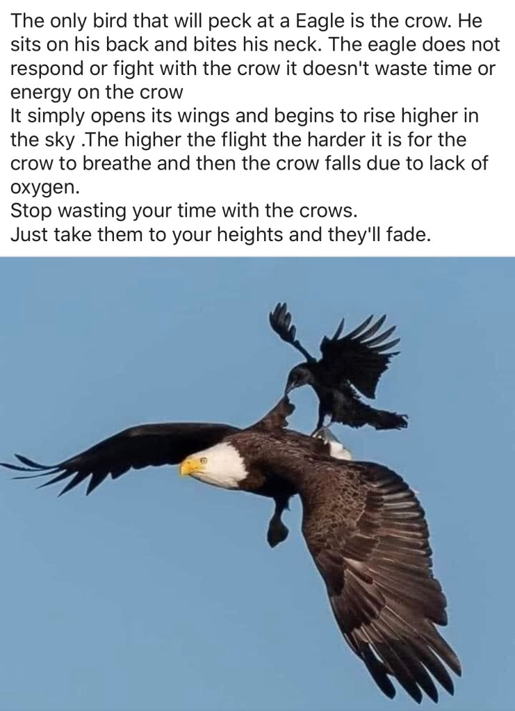 When Satan attacks you like the crow attacks the eagle, don’t waste your time and energy in fighting him. Call upon God. Raise your heart, soul, and mind to Him in prayer. As you lift your words up, ask God to help and save you. Like the crow, Satan doesn’t tolerate the atmosphere and will not stick around.