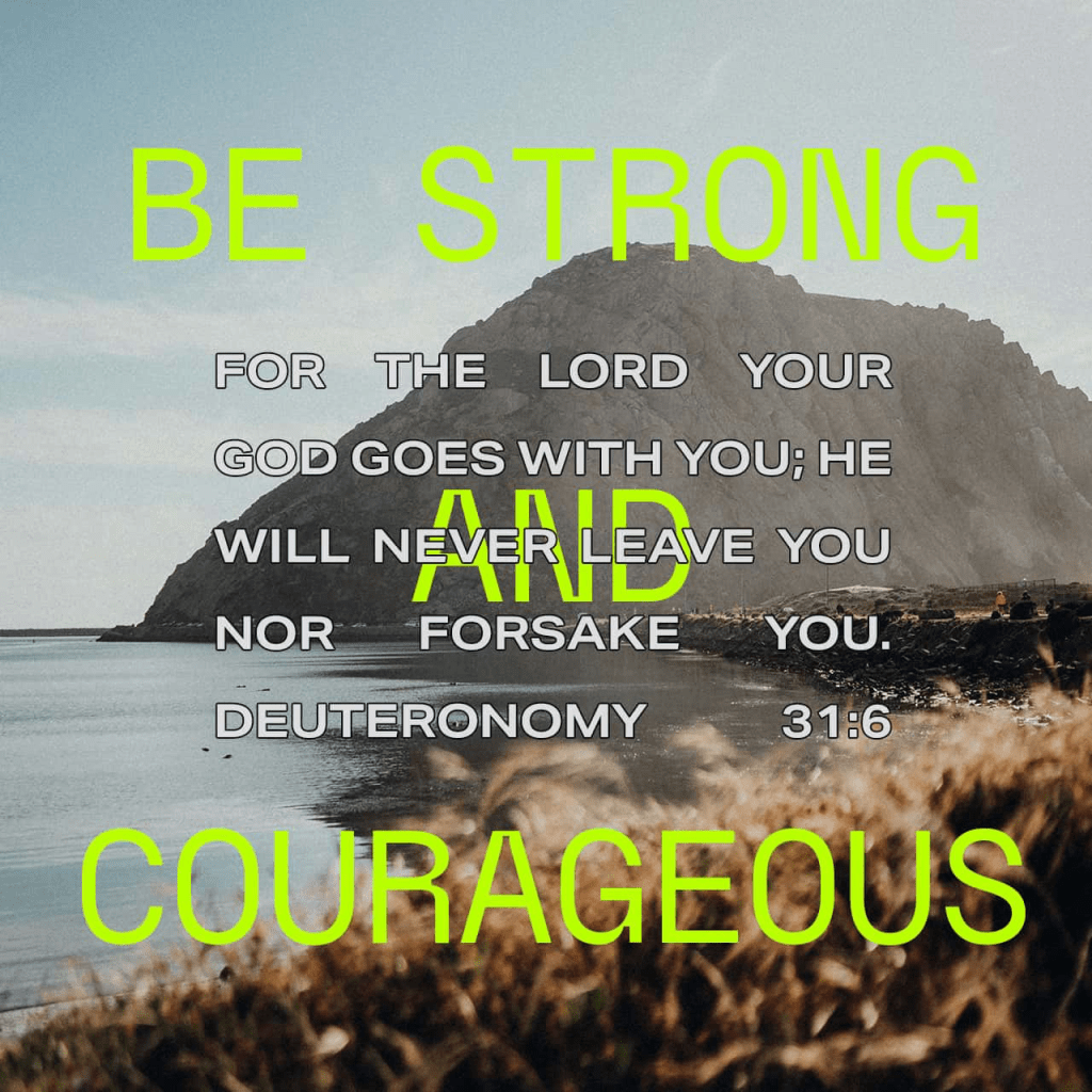“Be strong. Take courage. Don’t be intimidated. Don’t give them a second thought because GOD, your God, is striding ahead of you. He’s right there with you. He won’t let you down; he won’t leave you.”” Deuteronomy 31:6 MSG https://www.bible.com/97/deu.31.6.msg