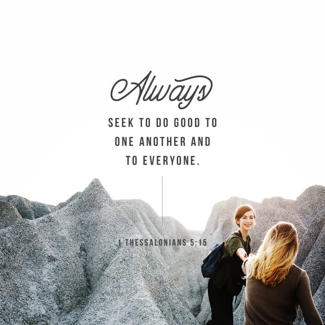 “Brothers and sisters, we urge you to warn those who are lazy. Encourage those who are timid. Take tender care of those who are weak. Be patient with everyone. See that no one pays back evil for evil, but always try to do good to each other and to all people. Always be joyful. Never stop praying. Be thankful in all circumstances, for this is God’s will for you who belong to Christ Jesus.”