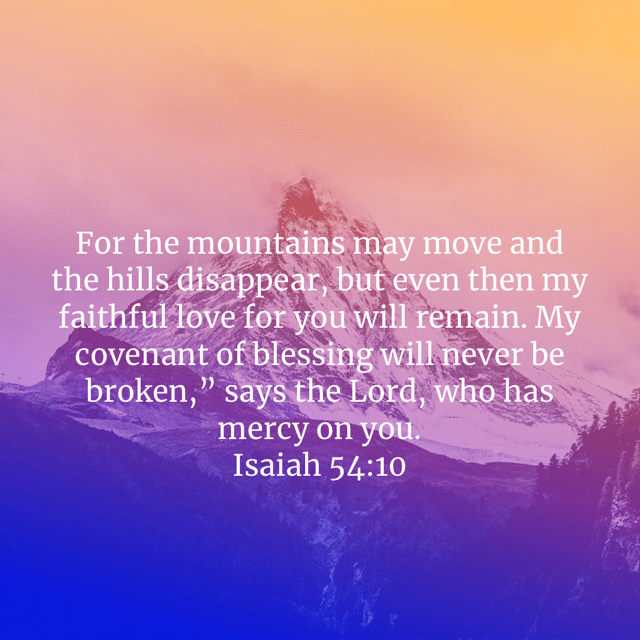 Everything in this world will fade away, even the majestic mountains and hills. God says, even then my love will remain for you. His promise of blessings will never be destroyed. We serve an almighty God that is full of mercy, love and compassion. Enjoy your day!