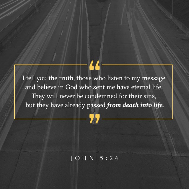 ““I tell you the truth, those who listen to my message and believe in God who sent me have eternal life. They will never be condemned for their sins, but they have already passed from death into life.”