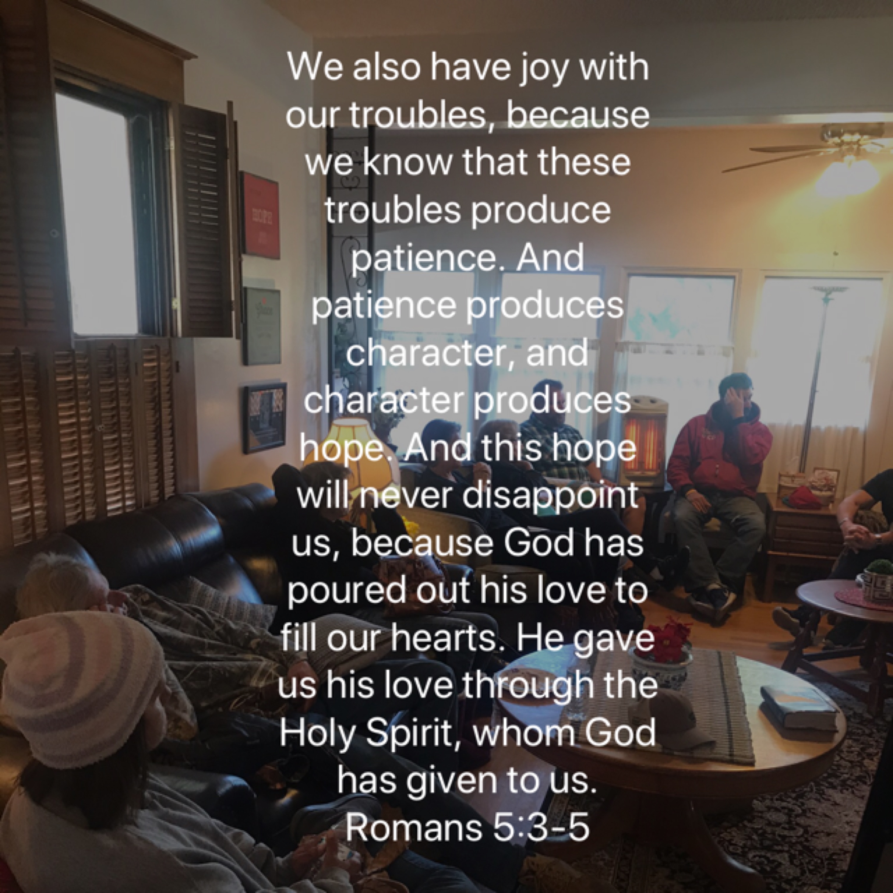 Thank you Heavenly Father, for giving us joy no matter what are circumstances are. You fill our hearts with HOPE and LOVE. Thank you for providing our needs and watching over us as we journey through life. We are your children and you are our God. Amen.
