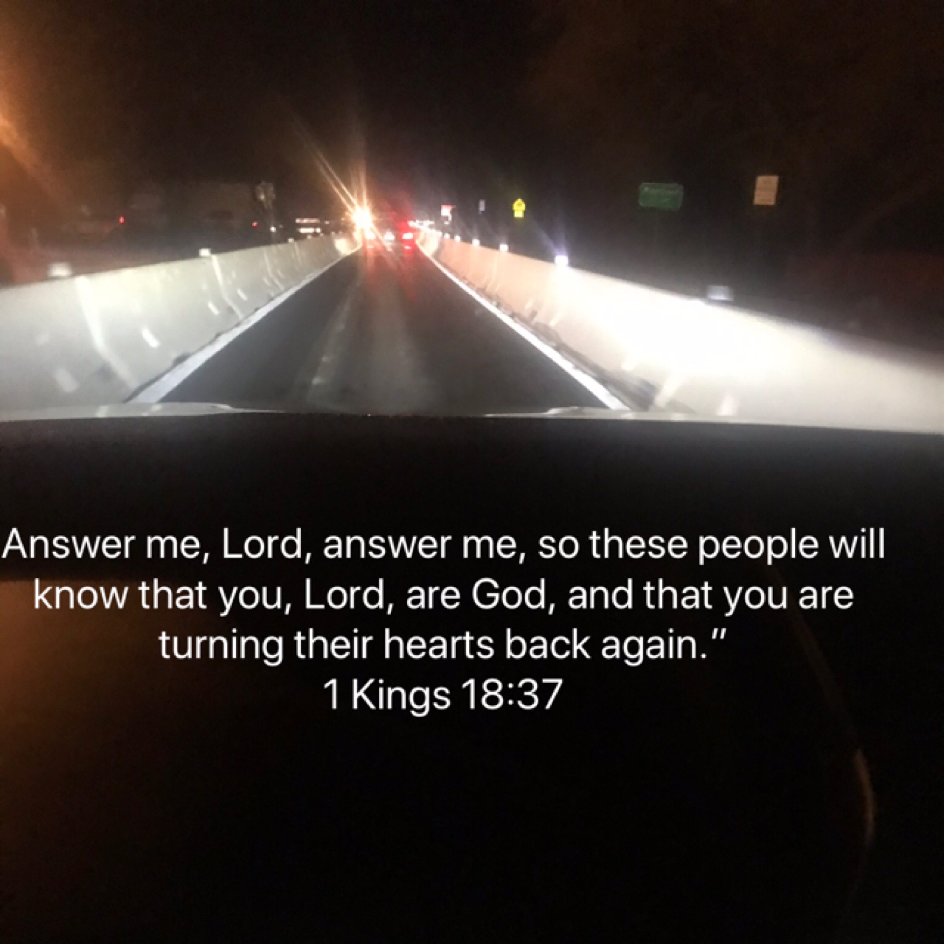 As I was driving home one night in a road construction area I took this picture. It spoke volumes to me on Christian prayer life. Surrounded by darkness of the world, when we pray it’s like the straight and narrow path is illuminated for others to see. As we cry out, Answer me, Lord, answer me, so these people will know that you, Lord are God, and that you are turning their hearts back again. Glory be to God he is turning our loved ones hearts back to him. Keep on praying never give up for Isaiah 65:24 Says, Before they call I will answer; while they are still speaking I will hear.