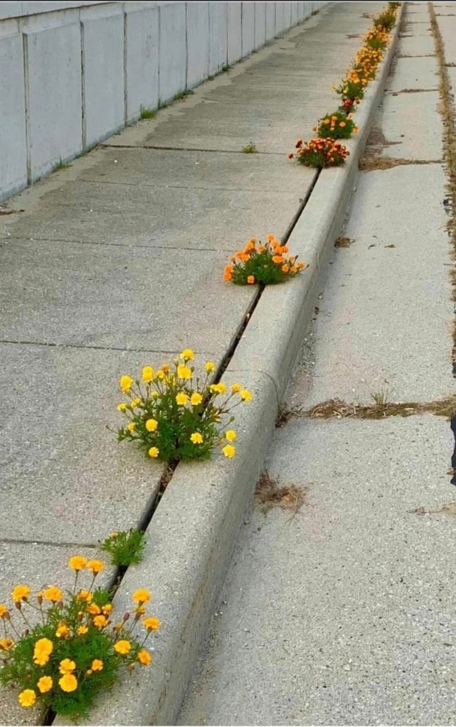 When I saw the above picture, the caption caught my eye. A class of kindergartens experimented and dropped seeds along the sidewalk edge to see if the flowers would grow. I could only imagine a group of 5-year-old children trying to place seeds right along the sidewalk’s edge. If they were anything like the children I know in kindergarten, I surmise there were seeds dropped, thrown, or placed in areas other than the desired location. Maybe by the fence or between the sidewalk cracks. Possibly in the gutter among the dried weeds.