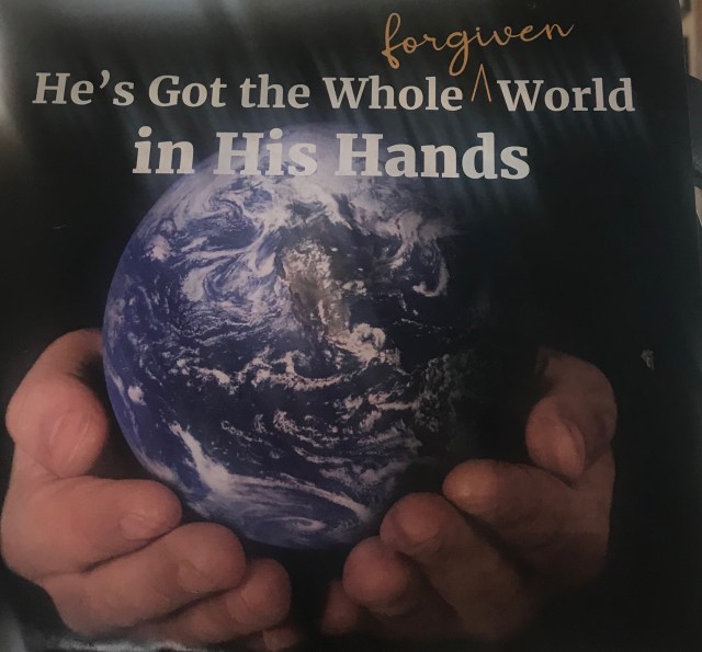 When I was young and sang the song, He’s got the whole world in his hands, I felt safe in Gods hands. When I saw the above picture and read it, He’s got the whole FORGIVEN world in his hands, I feel loved.