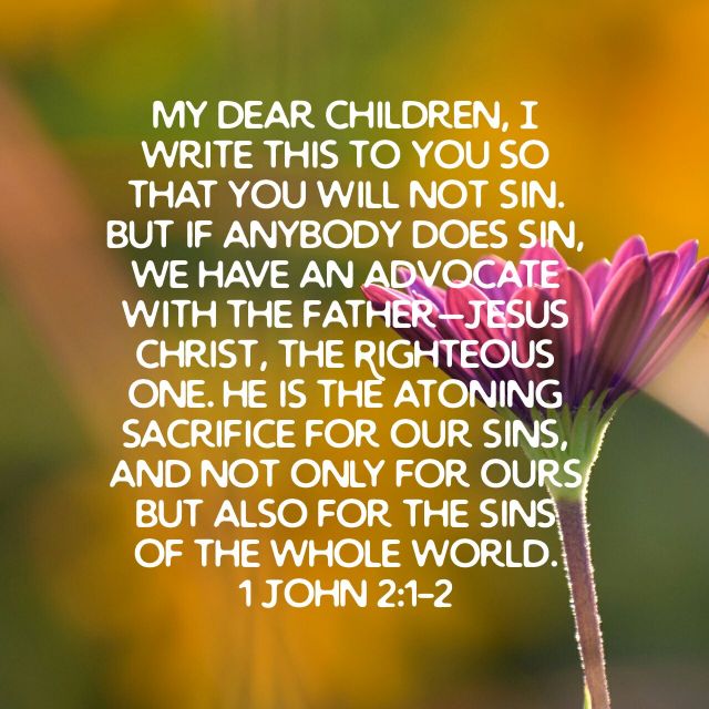 My dear children, I write this to you so that you will not sin. But if anybody does sin, we have an advocate with the Father—Jesus Christ, the Righteous One. He is the atoning sacrifice for our sins, and not only for ours but also for the sins of the whole world.