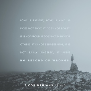 Love is patient, love is kind. It does not envy, it does not boast, it is not proud. It does not dishonor others, it is not self-seeking, it is not easily angered, it keeps no record of wrongs.